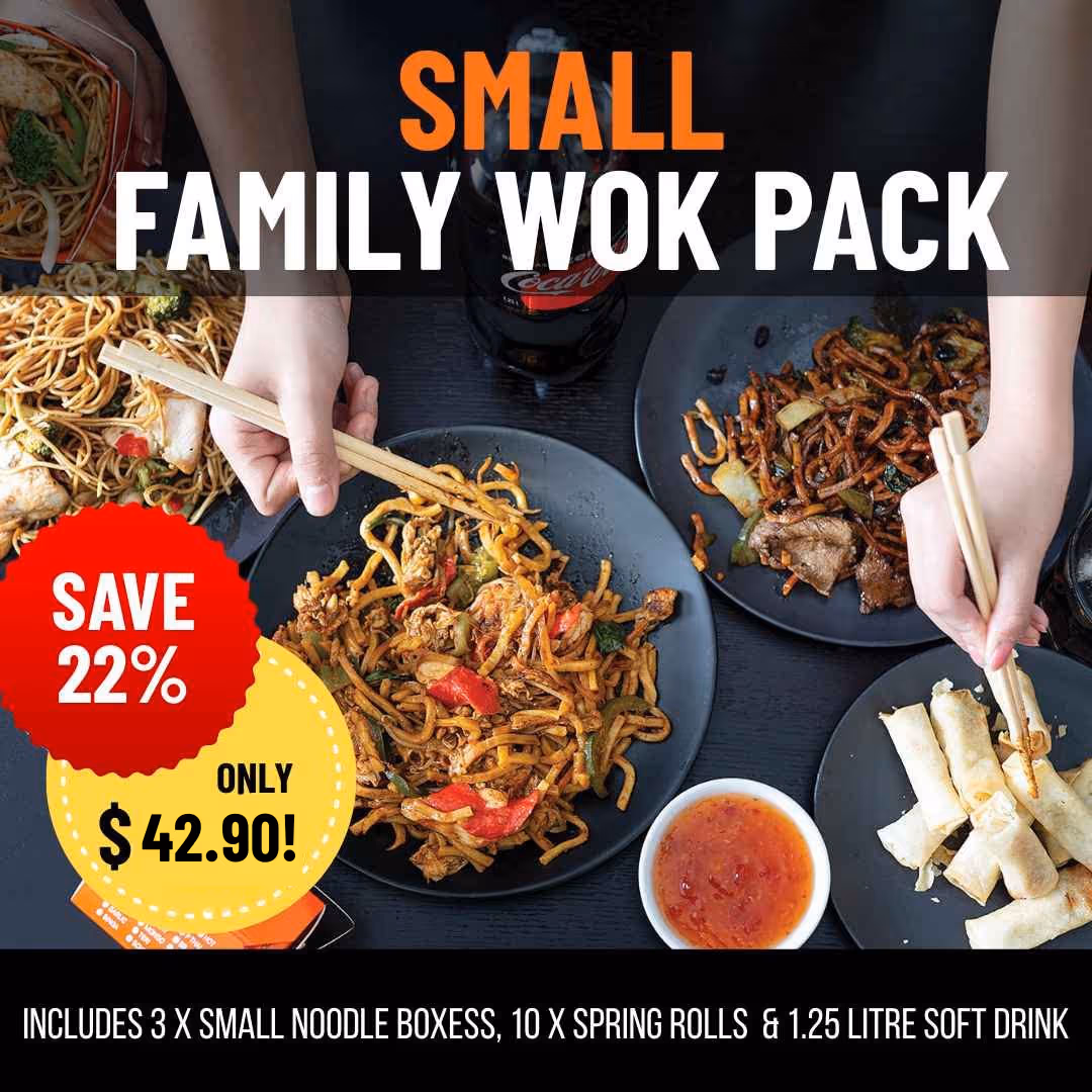 SMALL FAMILY PACK: 3 x Small Noodle Boxes 10 x Crispy Spring Rolls plus sweet chilli sauce 1.25 Litre Soft Drink SAVE 22% with the Pack! Just $42.90! BIG FLAVOUR, BIG SAVINGS, NO FUSS!